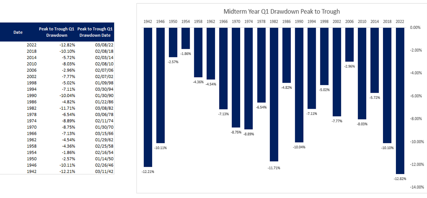 Since 1942, more than half of midterm years have seen the S&P 500 tumble 7% or more at some point in the first quarter. That’s 12 out of 21 midterm years suffering a ≥7% Q1 correction. Whether it’s uncertainty around policy shifts, election posturing, or just the market’s own seasonal quirks, something often knocks the market down early in those years.