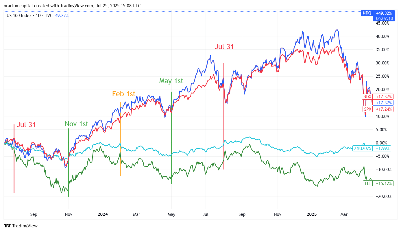 Coming into the final week of July, we get two important policy-related events: the Treasury’s new quarterly refunding announcement (QRA) on Monday and then the composition of bond issuance on Wednesday, followed by the FOMC meeting on Wednesday, the day before the month end. In addition to this, the tariff deadline day is August 1st (Friday), and we get four of the Mag7 company earnings on Wed and Thu.