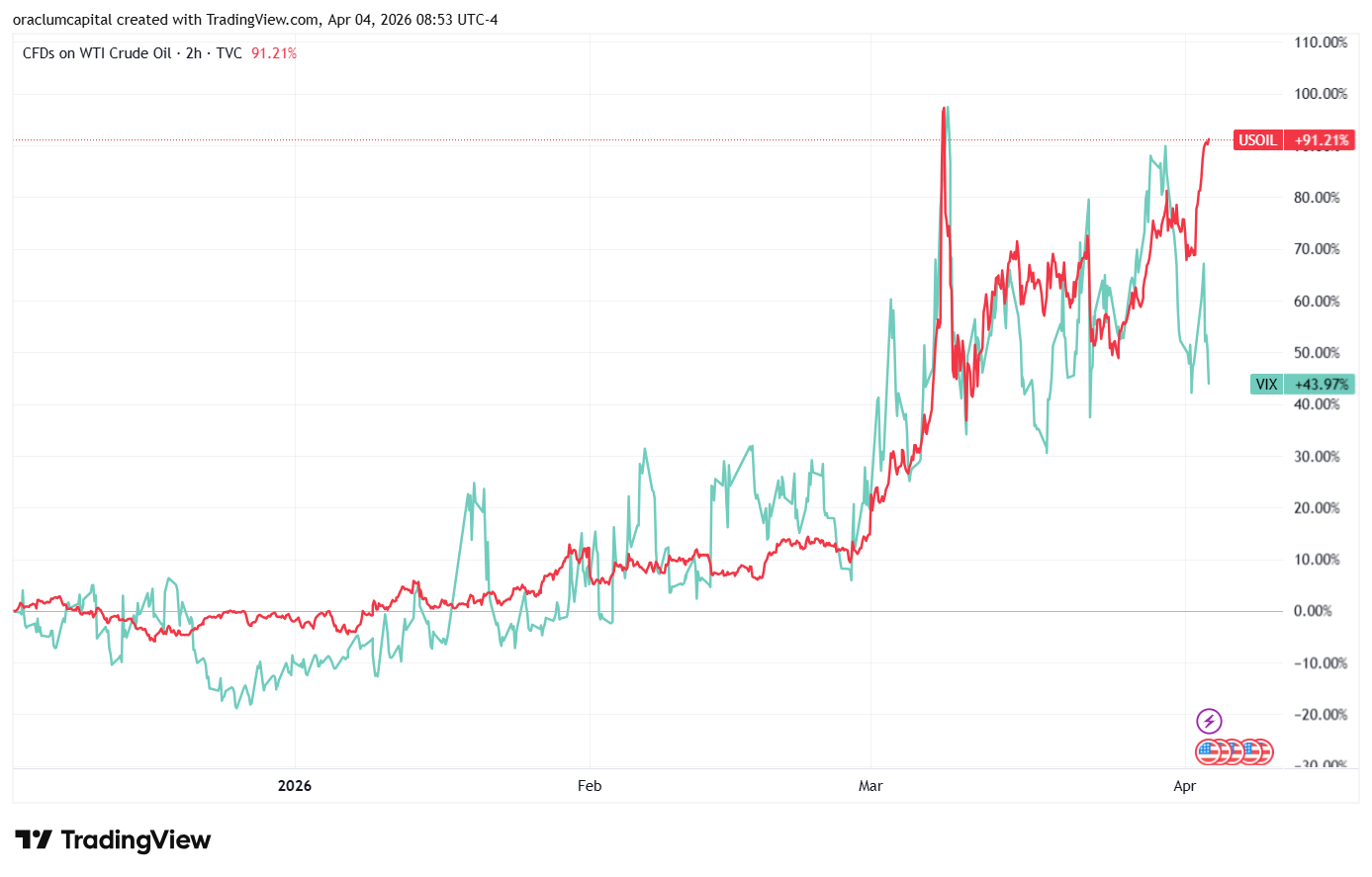 Last week ended with a very interesting decoupling of correlation between oil and equities. Oil jumped 12% on Thursday, last day of trading, following Trump’s press conference late night Wednesday where he didn’t show signs of backing out as was expected - quite the opposite, he talked about more bombings and more escalation. Oil prices shot up and ended the next day up 12%, finishing over $112 a barrel, and up over 90% in 2026 thus far.