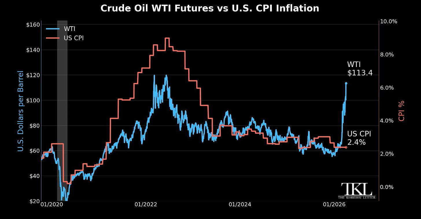 The estimate from the Kobeissi Letter is that another 2 months of oil being above $100, we would see a rise of US CPI inflation to 3.3% (so almost 100 basis points from where it currently is).